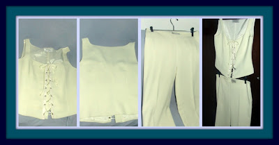 Lindo conjunto composto por um corpete/colete e calça de alfaiataria, sem bolsos, em tecido nobre,acho que é algo como um crepe de seda, não tenho certeza, vou me informar. Todo forrado o corpete, cor marfim lindo. Pouco usado, quase novo, tamanho P.