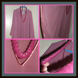 Tamanho GG, é de um tom de rosa velho e tem todo o acabamento em viés de seda rosa. É de um tecido transparente, de excelente qualidade.